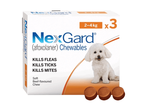 נקסגארד לכלבים במשקל 2-4 ק”ג, 3 כדורים בחבילה, כל כדור מספיק לחודש.