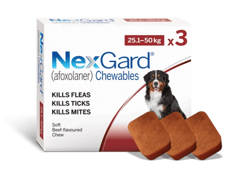 נקסגארד לכלבים במשקל 25-50 ק”ג, 3 כדורים בחבילה, כל כדור מספיק לחודש.
