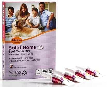 Soltif Home הוא המוצר הבטוח ביותר לשימוש בתוך הבית, בסביבת ילדים וחיות אחרות משום שמכיל מינימום כימיקלים ובעל מנגנון ספיגה מהיר אשר נותן פתרון לבעיית הפרעושים והקרציות. בזכות יעילות החומר ומהירות הספיגה, Soltif Home מגן על כלבך ממחלות המועברות על-ידי הטפילים בכך שאינו מאפשר לטפיל לעקוץ וקוטל אותו באופן מידי, על ידי מגע בלבד. Soltif Home מספק הגנה מרבית נגד פרעושים וקרציות כשעתיים אחרי הטיפול! אמפולת Soltif Home אפקטיבית בזכות שילוב חומרים חדשני אשר הטפילים טרם פיתחו נגדו עמידות. כל שפורפרת של 3 מ”ל מכילה בתוכה את החומרים הפעילים: דינוטפורן (Dinotefuran) – חומר פעיל מהדור החדש, קוטל פרעושים על ידי מגע בלבד ומעניק לכלבך את ההגנה המושלמת תוך זמן קצר. פלומטרין (Flumethrin) – חומר פעיל יעיל ובטוח, קוטל את הקרציות במהירות ואף דוחה אותם באמצעות תכונת ה”רגליים הבוערות”, הקרציות חשות צריבה ברגליהן ואינן מסוגלות להיצמד לכלבך. שילוב של שני החומרים מעניק לכלבך בנוסף, הגנה מרבית מפני יתושים וזבובים.