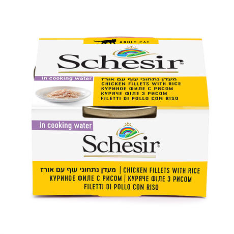 מעדן שזיר נתחוני עוף עם אורז במי בישול 85 גר’ מזון משלים לחתולים בוגרים.