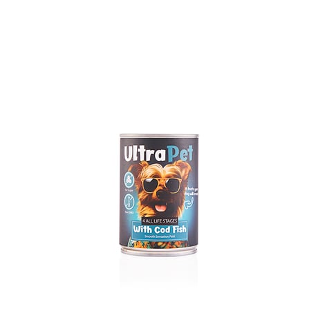 שימורי כלב בטעם דג קוד מבית אולטרה פט, בעל טעימות גבוהה ומכיל 400 גרם.
