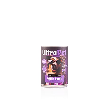 שימורי כלב בטעם כבש מבית אולטרה פט, בעל טעימות גבוהה ומכיל 400 גרם.