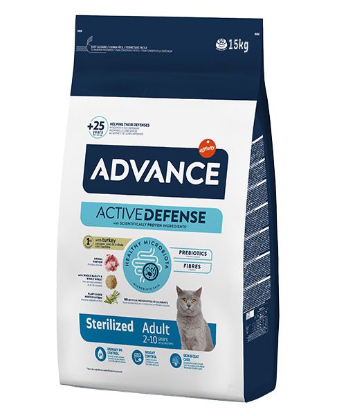 מזון חתולים באיכות גבוהה מומלץ לחתולים מעוקרים. עוזר למנוע השמנת יתר אצל חתולים מעוקרים. הודות לרמה מופחתת של אנרגיה קלורית , תוכן סיבים גבוה כדי לקדם תחושה של מלאות, מכיל תכולת חלבון גבוהה ותוכן שומן מתון כדי לסייע בשמירה על מסת שריר. עוזר להפחית את הסיכון לבעיות בדרכי השתן על ידי שמירה על רמות pH נכונות, הגדלת רמות הנתרן כדי להגדיל את ספיגת המים ואת פליטת השתן. האוכל מספק לחתול רכיבים המסייעים לשלוט על היווצרות של אבנים בשתן. מכיל סיבים של שיבולת שועל עם תמצית מאלט העוזר לשלוט על היווצרות של כדורי שיער ומקדם את סילוקם. מכיל חלבונים טבעיים אשר עוזרים לבריאות מערכת חילוף החומרים. הגנת חלבון IGH שמספק את הרמה האופטימלית של חלבונים כדי לעזור לשפר את התגובה החיסונית ולפתח את השרירים המתאימים. מכיל פוליפנולים טבעיים שעוזרים בעיכוב ההזדקנות הסלולרית יחד עם ויטמינים. פוליפנולים טבעיים שעוזרים בעיכוב ההזדקנות הסלולרית יחד עם ויטמינים. השילוב של מינרלים וחומרים נוספים עוזרים לפעילות דרכי השתן, תודות לרמת חומציות אידיאלית. מסייע במניעת היווצרות של אבנית בשן וגורם לנשימה טריה. תוצרת אדוונס אוכל לחתול סטרילייזד הודו 15 ק”ג- ADVANCE.