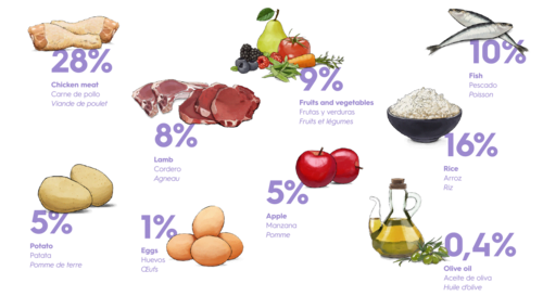 בשר עוף מיובש 27%, אורז 16%, דגים כחולים מיובשים 10%, בשר כבש מיובש 8%, אפונה 5%, תפוח אדמה 5%, תפוח 5%, שמן סלמון, פירות וירקות 4% – אגס, סלק, גזר, עגבנייה, פירות אדומים, פירות הדר), ביצים 2%, זרעי פשתן, אבקת חלב, שמרי בירה, פוטסיום כלוריד, תמצית קירל + פורמולת פרוביטל 2%: שמן זית 0.4%, מולי ים, סרטנים לאחר הידרוליזה (1200 מ"ג מקור טבעי לגלוקוזמין), סחוס לאחר הידרוליזה (900 מ"ג מקור טבעי לכונדרויטין), תרד, עלי כותרת ציפורן החתול (מקור טבעי ללוטאין), אלפלפא, אצות (ספירולינה), ברוקולי, תמצית פרח שן הארי, תמצית עלי מנטה, קמומיל, שמן זיפן, פירות אדומים, קורנית, אורגנו, תמצית זרעי גדילן, תמצית יוקה מוג׳אבה, רוזמרין, אלוורה, אינולין (FOS), שמרים (MOS). תמציות ארומתיות:תמצית פירות הדר: 100 מ״ג, תמצית תה: 20 מ״ג. חומרים משמרים טבעיים ונוגדי חמצון.