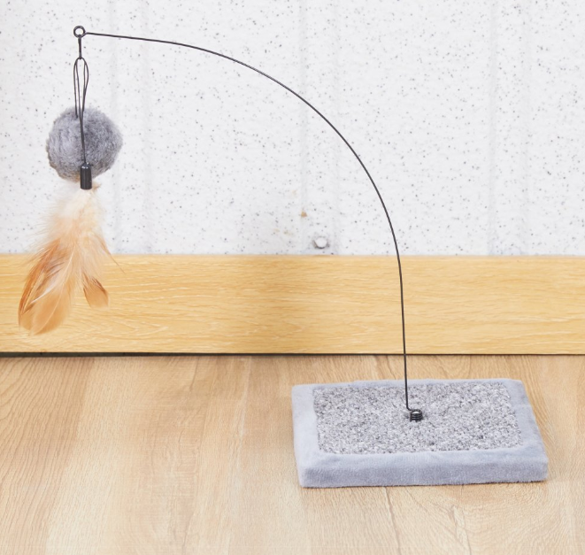 מתקן לחתול כדור עם נוצה על קפיץ לתעסוקת החתול לזמן רב. הקפיץ מחובר למשטח המיועד לגירוד הציפורניים של החתול. עוזר במניעת שריטות על רהיטי הבית.