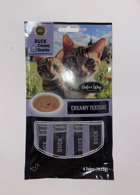 שלוקים לחתול של חברת נייטיב ווי בטעם ברווז. במרקם קרמי וחלק ובתוספת טאורין. פינוק אידיאלי שאי אפשר לעמוד בפניו! 4 שלוקים באריזה, 15 גרם כל יחידה.