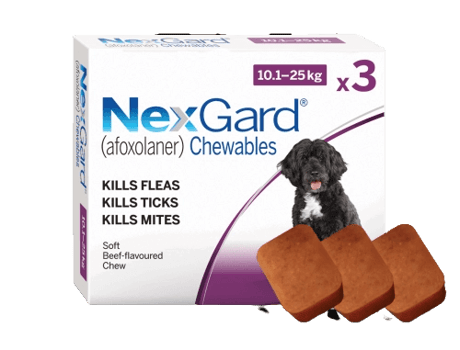 נקסגארד לכלבים במשקל 10-25 ק”ג, 3 כדורים בחבילה, כל כדור מספיק לחודש.
