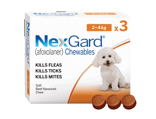 נקסגארד לכלבים במשקל 2-4 ק”ג, 3 כדורים בחבילה, כל כדור מספיק לחודש.