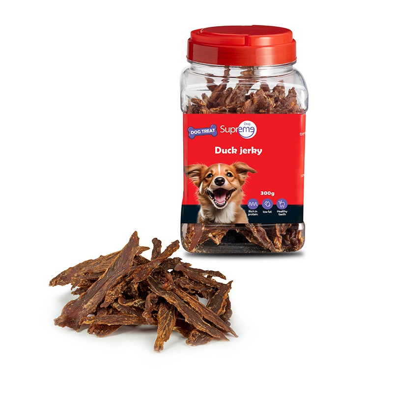 חטיף פינוק לכלב ג’רקי ברווז מופחת שומן, עשיר בחלבון וקל לעיכול. מקור בריא לאומגה 3 וחומצות שומן חיוניות. מספק אנרגיה ומעולה כחטיף אילוף. רכיבים טבעיים בלבד. צנצנת איכותית המכילה 300 גרם.