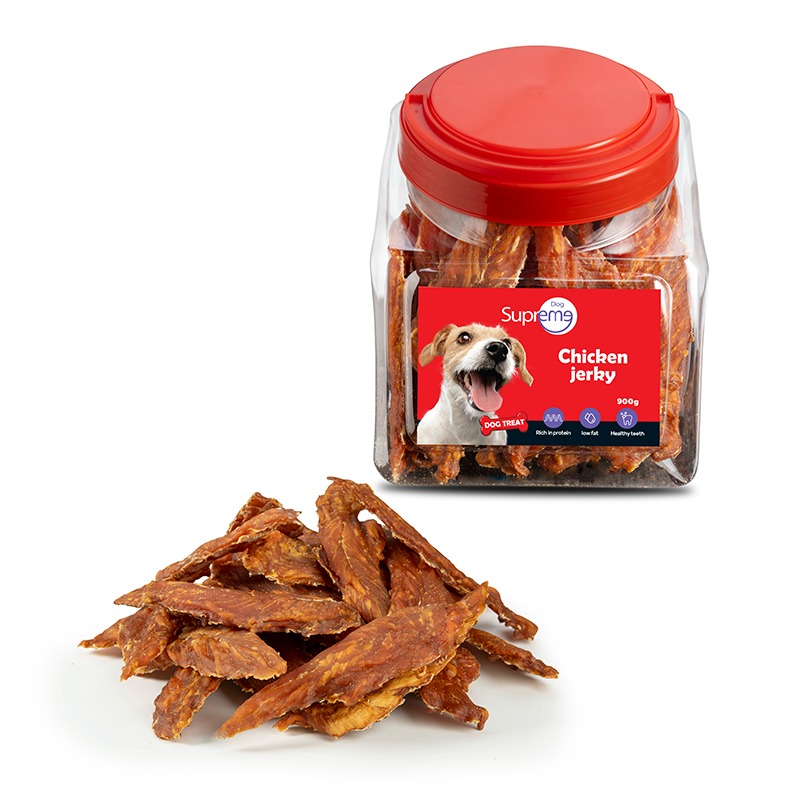 חטיף פינוק לכלב ג’רקי עוף מופחת שומן, עשיר בחלבון וקל לעיכול. מקור בריא לאומגה 3 וחומצות שומן חיוניות. מספק אנרגיה ומעולה כחטיף אילוף. רכיבים טבעיים בלבד. צנצנת איכותית המכילה 900 גרם.