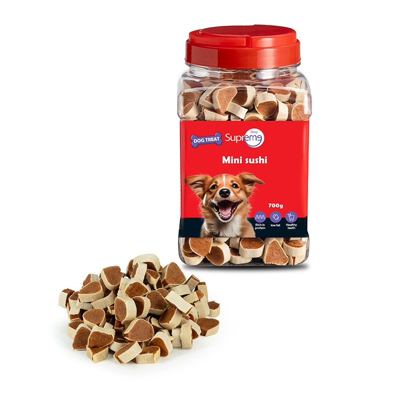 חטיף פינוק לכלב מיני סושי עוף ודג מופחת שומן, עשיר בחלבון וקל לעיכול. מקור בריא לאומגה 3 וחומצות שומן חיוניות. מספק אנרגיה ומעולה כחטיף אילוף. רכיבים טבעיים בלבד. צנצנת איכותית המכילה 700 גרם.