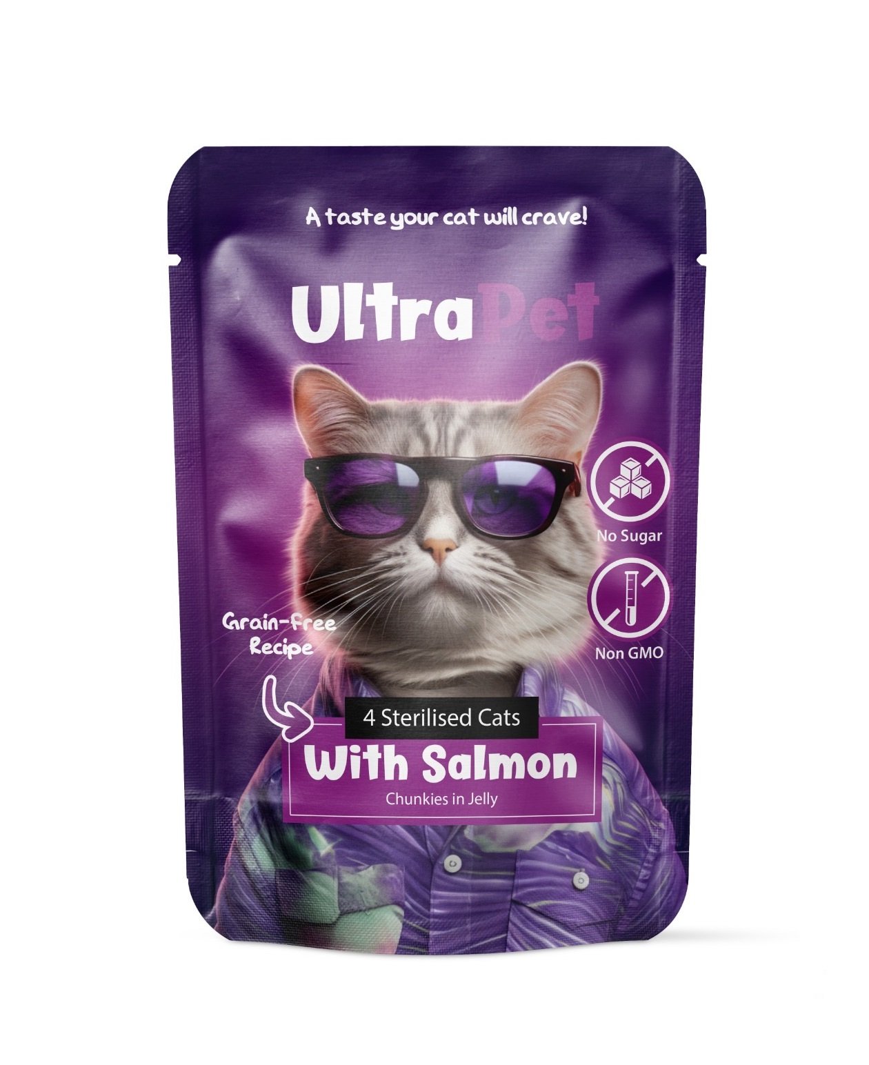 אולטרה פט פאוץ נתחי סלמון סטרלייז בג’לי 85 גרם מזון שימורים מלא ומאוזן לחתולים מסורסים/מעוקרים מעל גיל 3 חודשים.