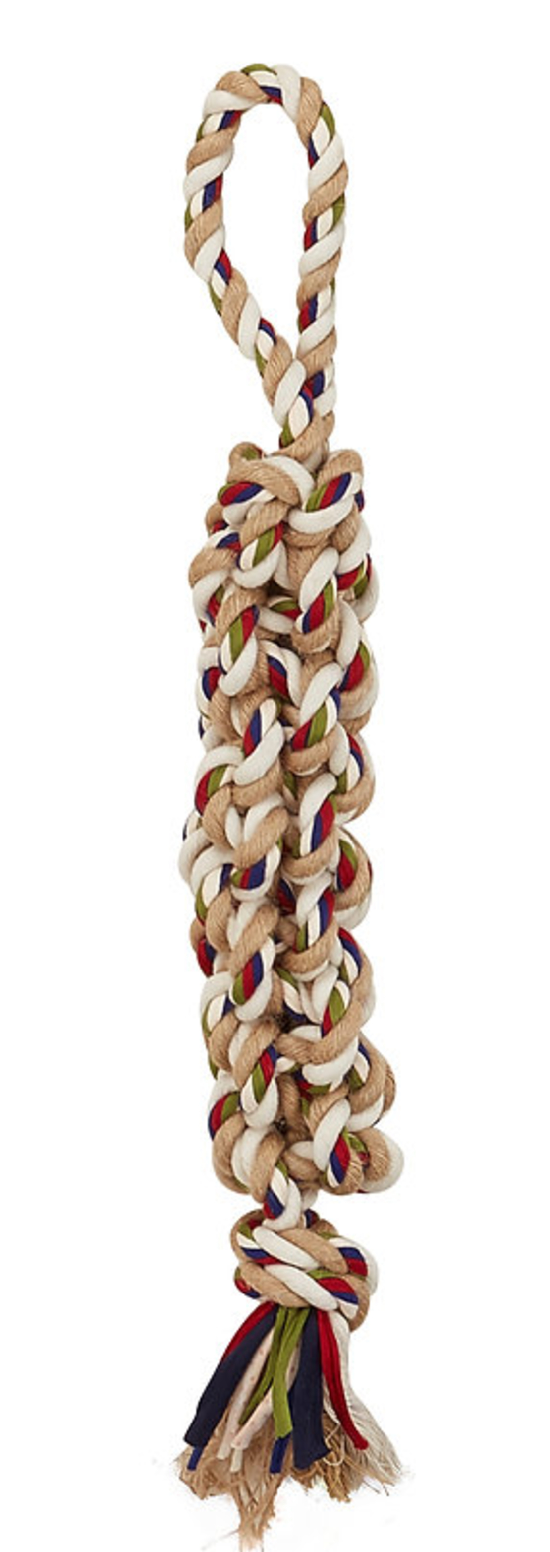 פופוס צעצוע חבל קלוע עם ידית לכלבים  הוא דרך מצוינת ליצור קשר עם הכלב שלך. עיצוב החבל הקלוע הוא הכלי המושלם לשחק איתו משיכת חבל ולתת לכלבים שלך לשחק אחד עם השני. התערובת מרובת החומרים של כותנה, פוליאסטר ויוטה מחזקת את המבנה הכללי של המוצר ומבטיחה שהם עמידים גם בעת משחק קשוח.