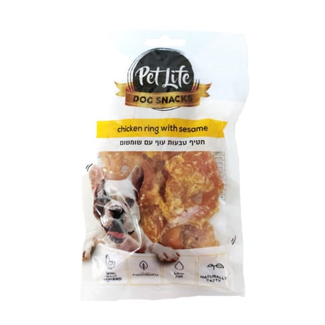 חטיף לכלב טבעות עוף עם שומשום, מתאים לכלבים מכל הגזעים ובכל שלבי החיים. טבעות פט לייף עשויות מעוף עם שומשום.