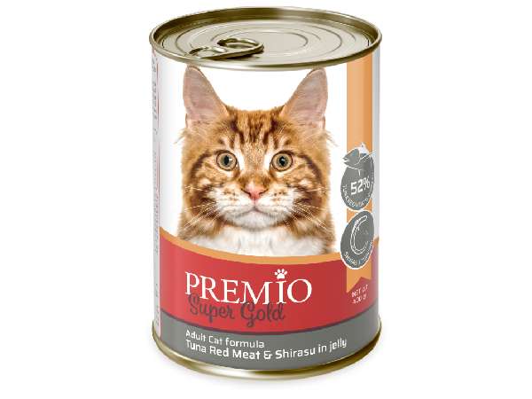 פרמיו סופר גולד שימורי מזון משלים לחתול בוגר עם בשר טונה אדומה עם שירסו. מכיל 400 גרם.