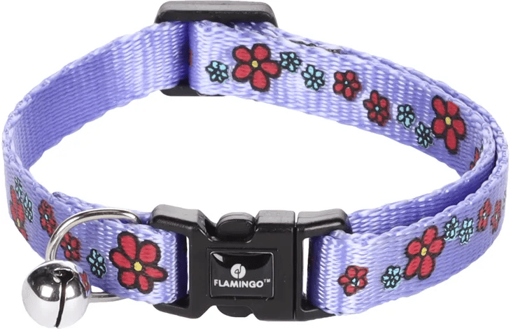 קולר לחתול בעיצוב סגול לילך עם הדפס פרחים🌸🐱, מתכוונן למידות של 20-35 ס”מ. קולר מעוצב ואיכותי שמביא שילוב מושלם של סגנון ונוחות לחתול שלך. כולל מנגנון בטיחות למניעת הסתבכות.