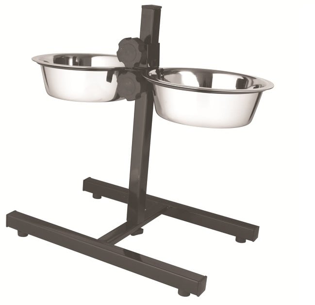 סטנד מתכוונן איכותי המגיע עם שתי קעריות נירוסטה בקוטר 29 ס”מ בינוניות לאוכל ולמים. המתקן מכוונן עד גובה 40 ס”מ כך שניתן לקבוע את גובה הקעריות.