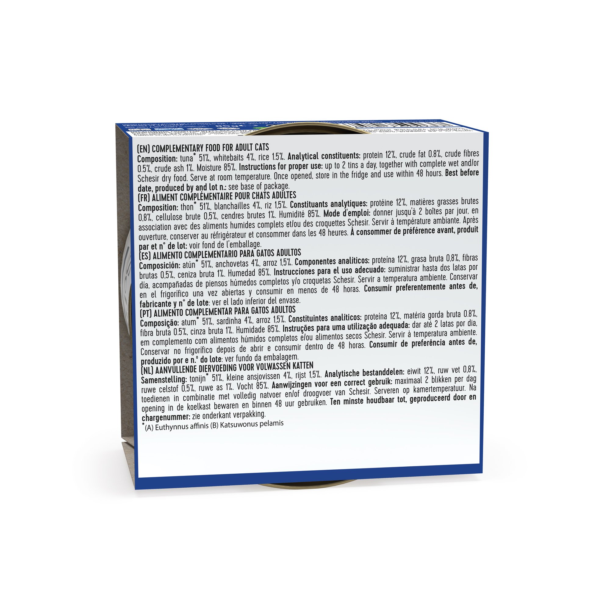 טונה 51%, דגיגי ווייטבייטס 4%, שמן חמניות מזוכך 2%, אורז 1.5%, מינרלים