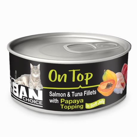 מעדן מבית אורבן צ’ויס בסדרת ON TOP בטעם טונה וסלמון בג’לי בתוספת פפאיה, שימור מזון משלים לחתולים בכל הגילאים. מומלץ לתת ממוצר זה כמות של עד 10 גרם לק”ג משקל גוף ביום ועד פחית ביום. יש לדאוג למים טריים וזמינים בכל עת. יש לאחסן את המוצר במקום קריר ויבש. לאחר פתיחה, לשמור בקירור וניתן לשימוש עד 48 שעות מרגע הפתיחה.
