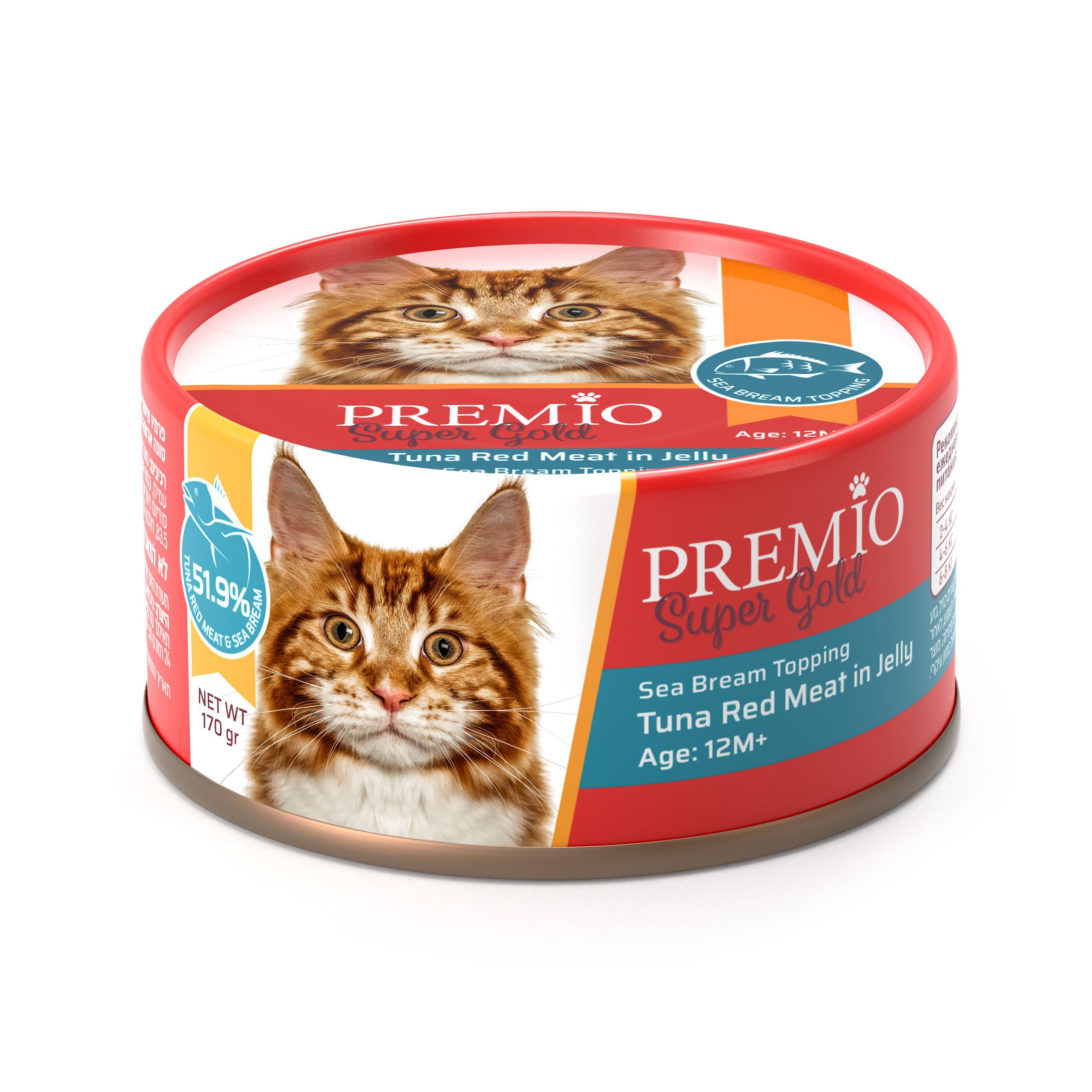 מעדן פרמיו סופר גולד – מעדן בשר טונה אדומה בציפוי דג דניס לחתולים בוגרים, במשקל 170 גרם.