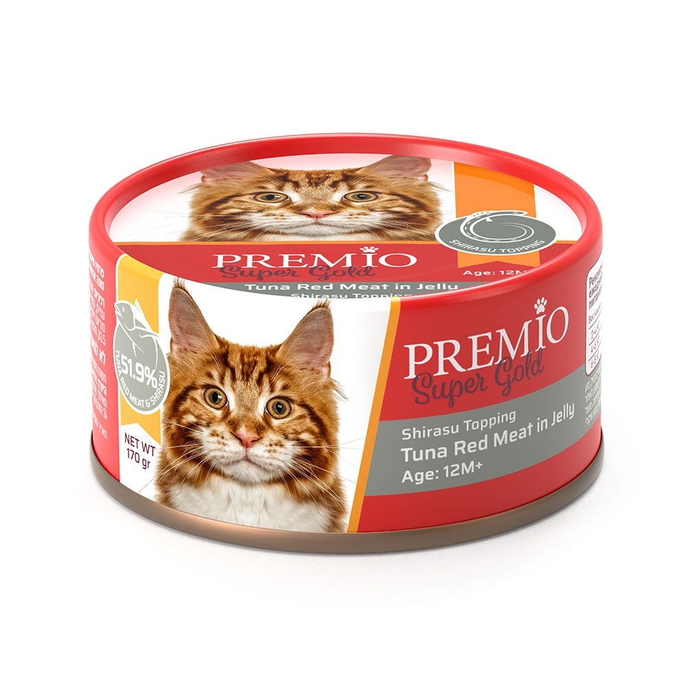 מעדן פרמיו סופר גולד – מעדן בשר טונה אדומה בציפוי שירסו לחתולים בוגרים, במשקל 170 גרם.
