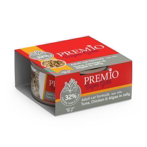 מעדן פרמיו סופר גולד מזון משלים לחתול בוגר עם כ60% עוף, טונה ואצות במרקם ג’לי