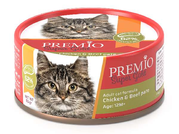 מעדן פרמיו סופר גולד מזון משלים לחתול בוגר עם 62% עוף ובקר במרקם פטה