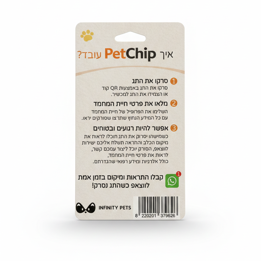 במקום תג רגיל עם מספר טלפון בלבד, PetChip מאפשר להציג מידע מלא ועדכני בכל רגע.