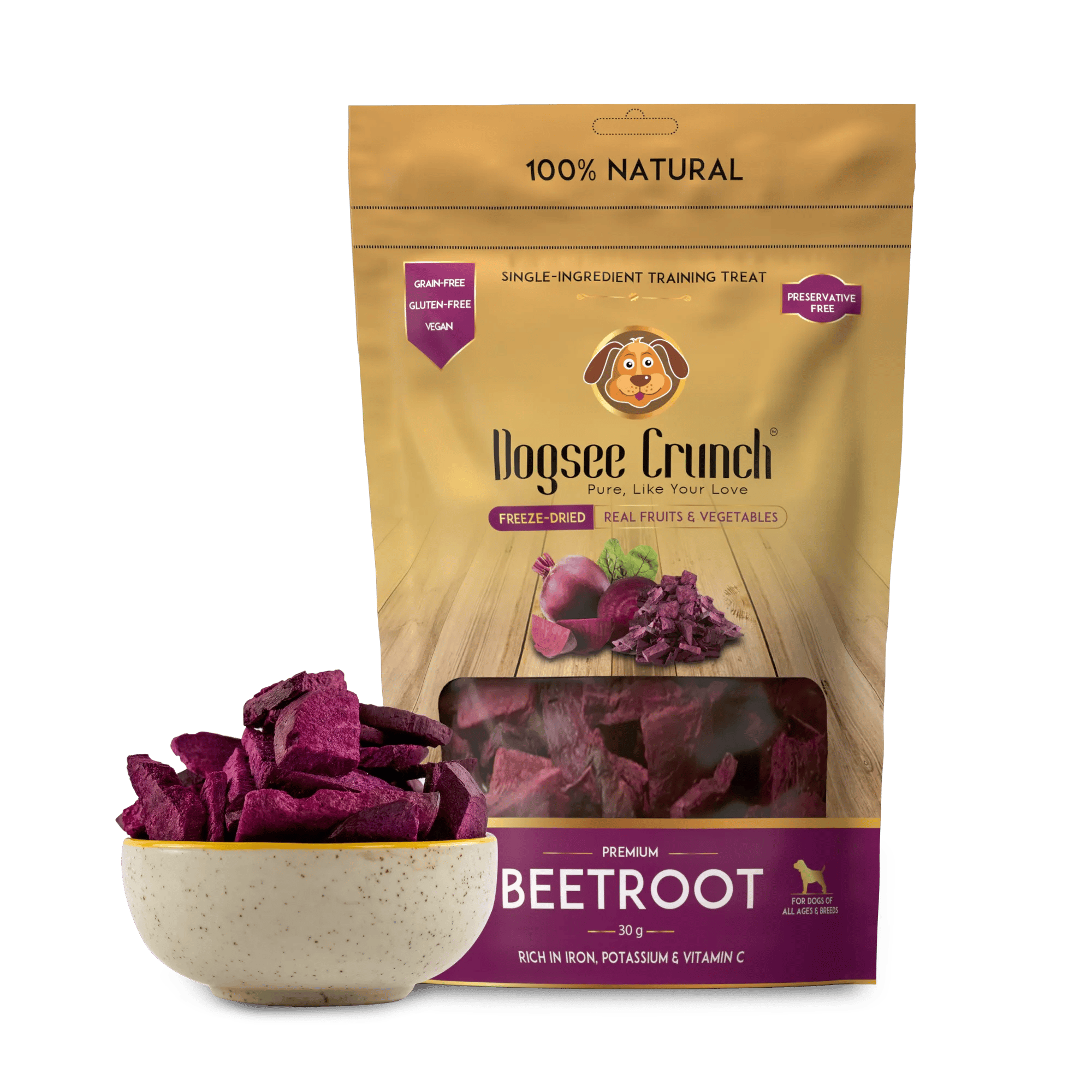 דוגסיי קראנץ’ סלק הוא חטיף אילוף המכיל מרכיב אחד, העשוי מסלק אמיתי בלבד. חטיפים אלה עשירים בסיבים תזונתיים המסייעים בחיזוק המערכת החיסונית של הכלב שלכם ובשמירה על מערכת עיכול בריאה. חטיפים אלה, ללא גלוטן, עמוסים בוויטמינים ומינרלים, מה שהופך אותם למושלמים לאילוף.